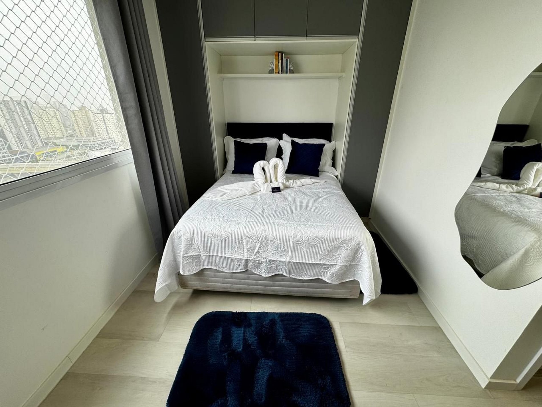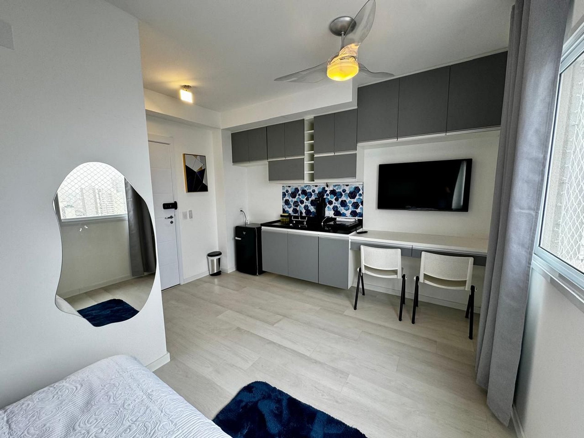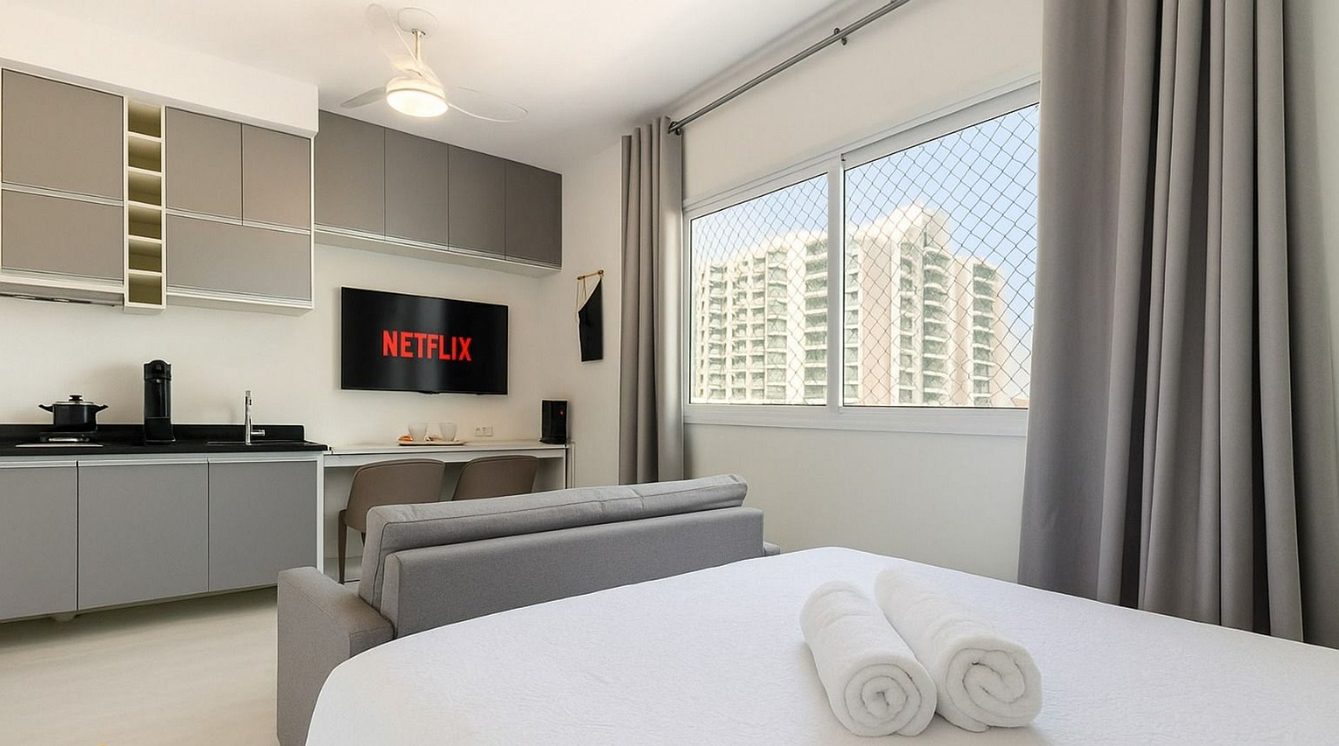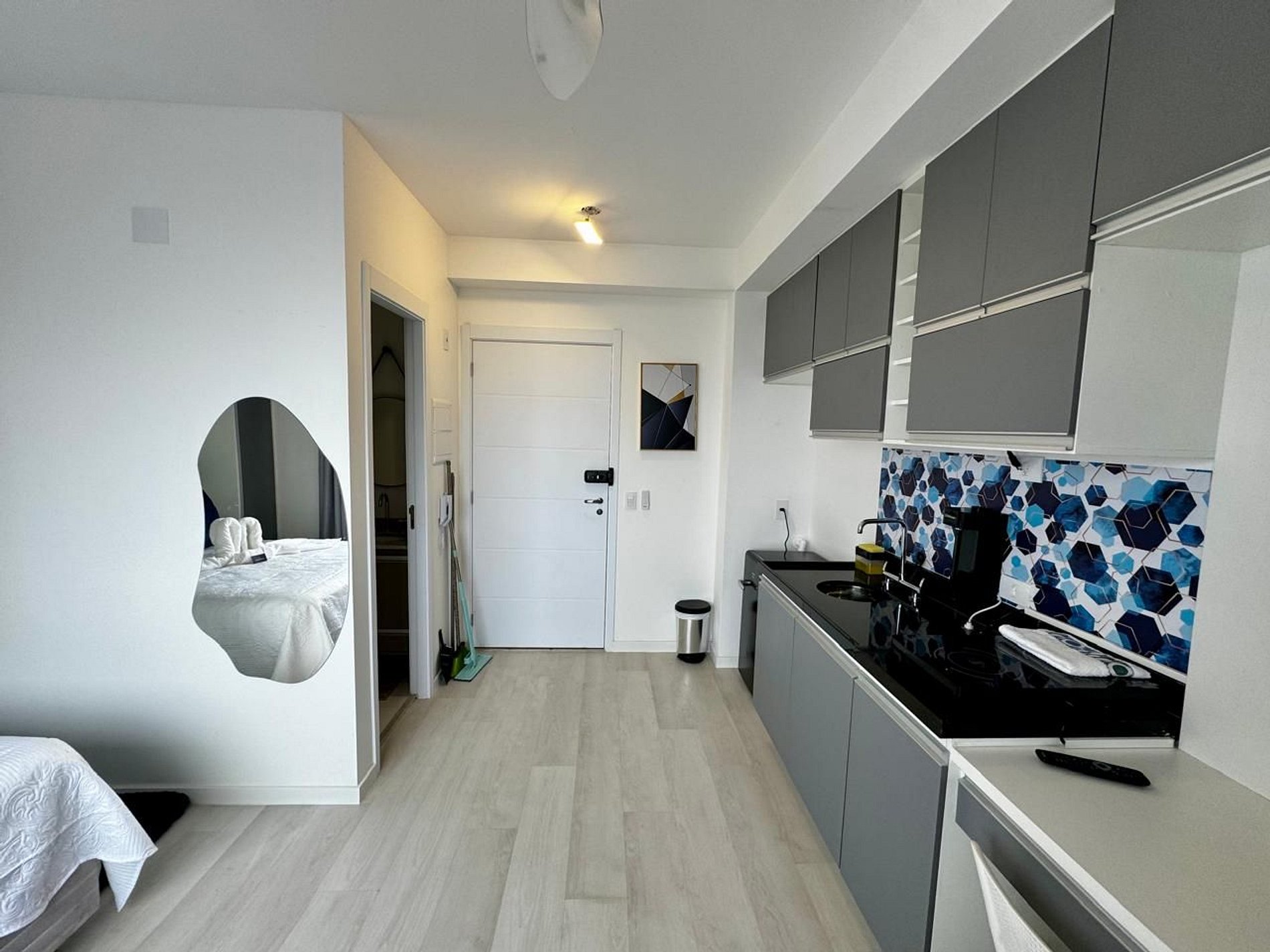 O espaço conta com cama de casal com cabeceira, armários planejados, cortinas blackout, fechadura digital para self check-in, além de cozinha equipada com micro-ondas, geladeira, cooktop e utensílios essenciais. Banheiro com acabamento em mármore e box de vidro. Enxoval de qualidade incluso.