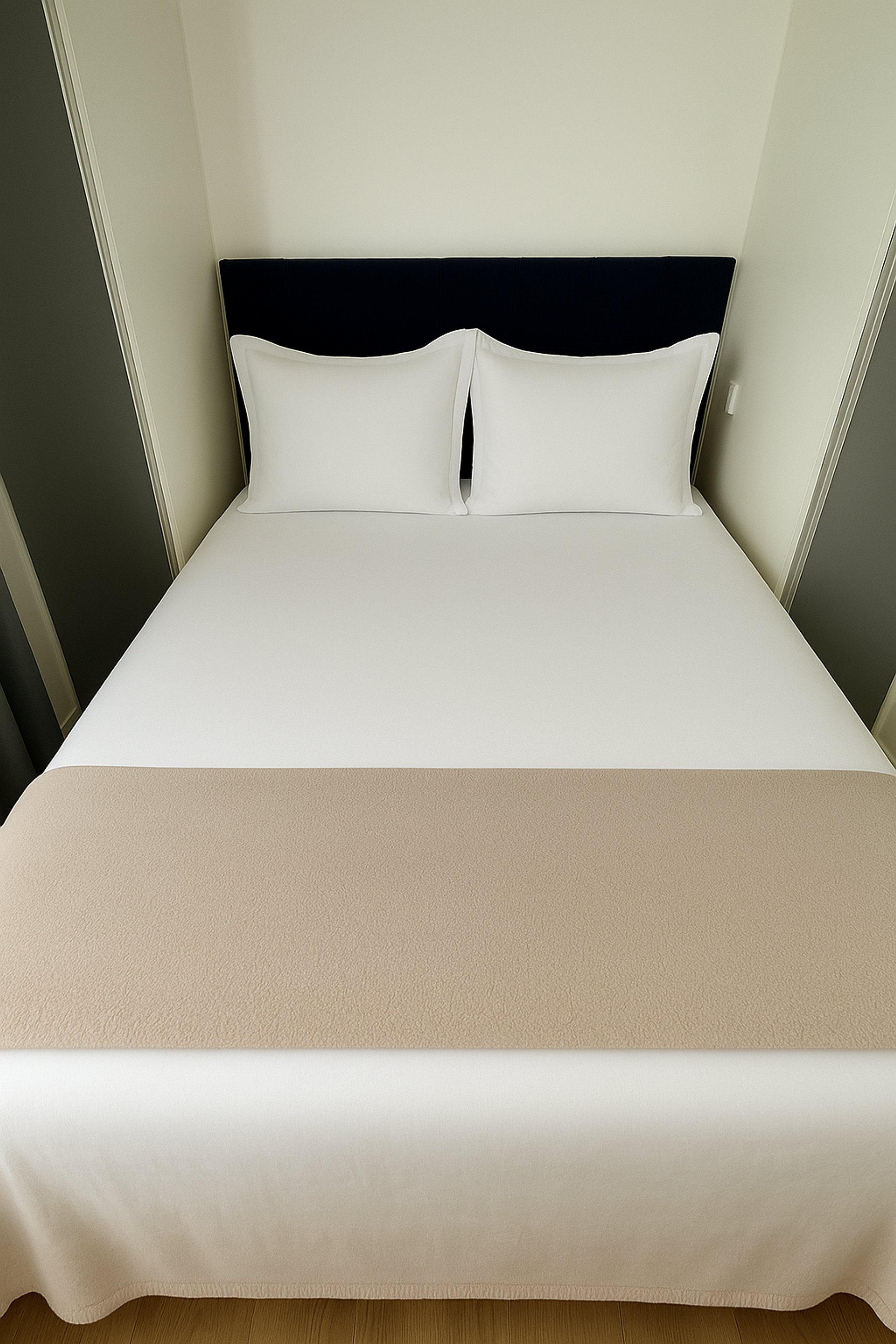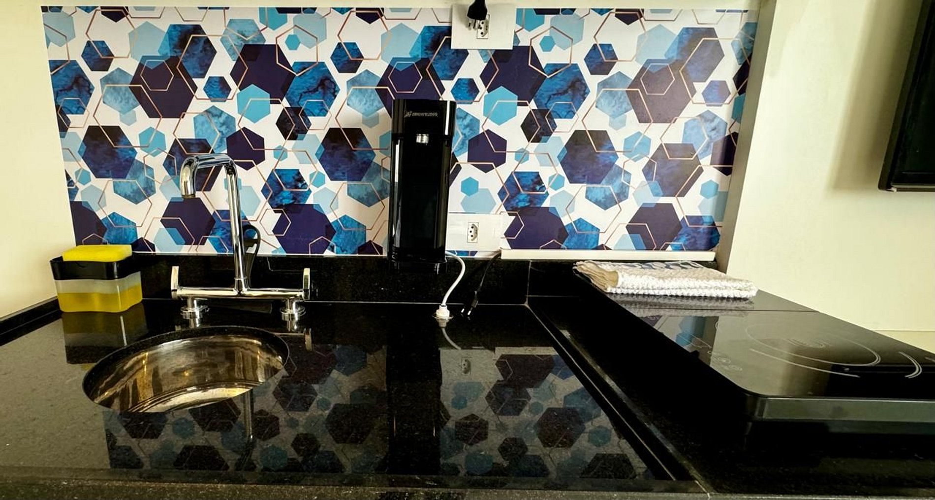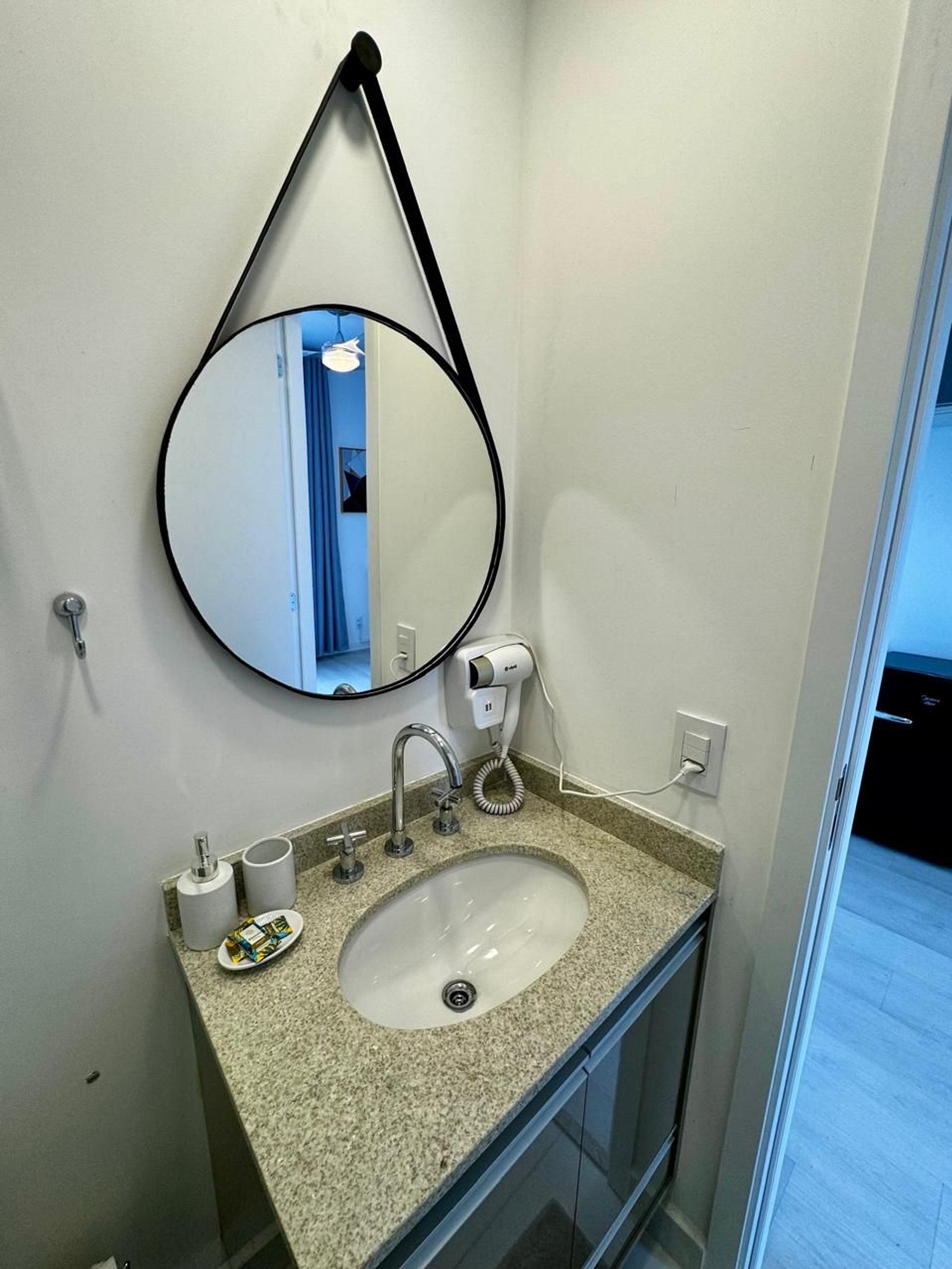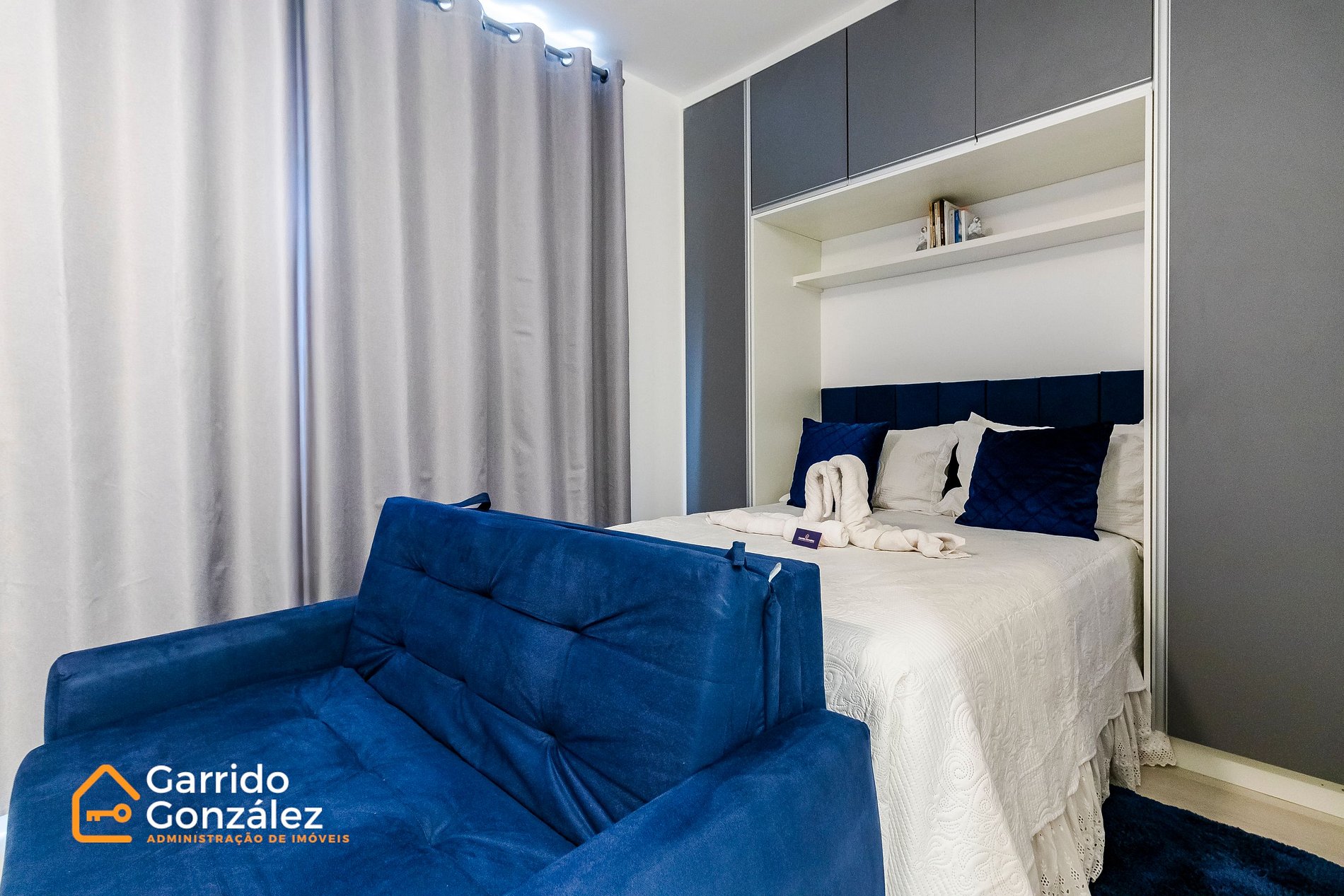 O espaço conta com cama de casal com cabeceira, armários planejados, cortinas blackout, fechadura digital para self check-in, além de cozinha equipada com micro-ondas, geladeira, cooktop e utensílios essenciais. Banheiro com acabamento em mármore e box de vidro. Enxoval de qualidade incluso.