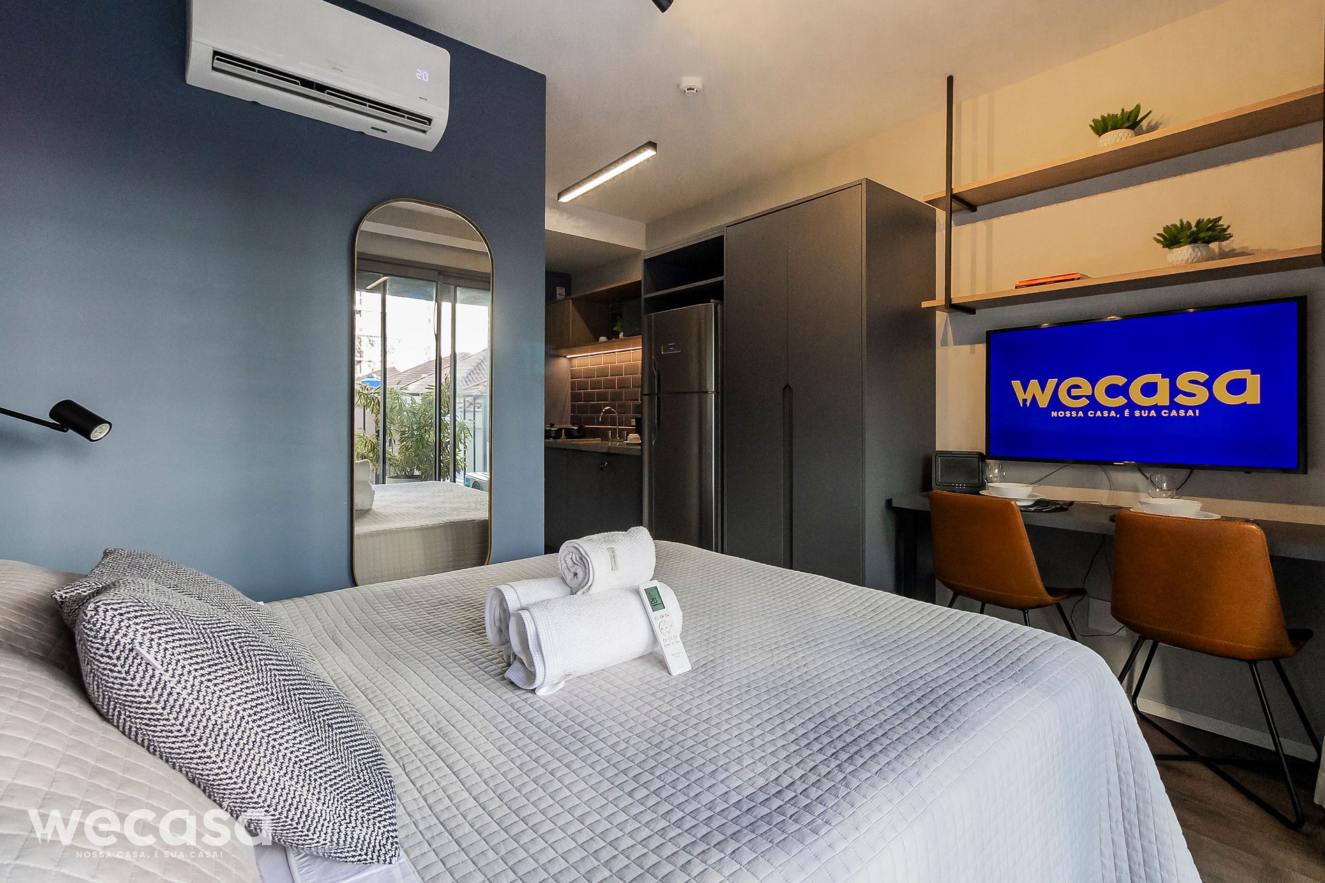 O studio é completo e funcional, com cama de casal, cozinha compacta equipada, Smart TV, Wi-Fi, ar-condicionado e enxoval de alto padrão e uma bela vista da cidade.
