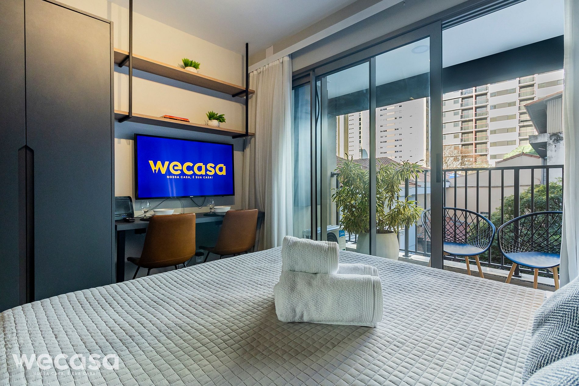 O studio é completo e funcional, com cama de casal, cozinha compacta equipada, Smart TV, Wi-Fi, ar-condicionado e enxoval de alto padrão e uma bela vista da cidade.
